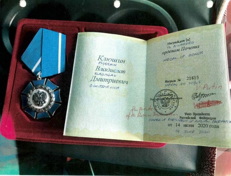 Bloomberg отмечает, что полтора года назад бизнесмен получил от президента России орден Почета и публикует фотографию награды, которая, как утверждается, находится в материалах американского суда в Массачусетсе. Кроме того, опубликована фотокопия пропуска Клюшина в Минобороны РФ.