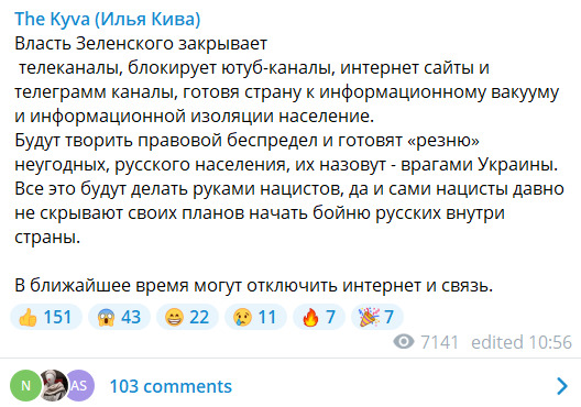 "Власть Зеленского закрывает телеканалы, блокирует ютуб-каналы, интернет сайты и телеграмм каналы, готовя страну к информационному вакууму и информационной изоляции население. Будут творить правовой беспредел и готовят "резню" неугодных, российского населения, их назовут врагами Украины", — говорится в публикации депутата парламента.