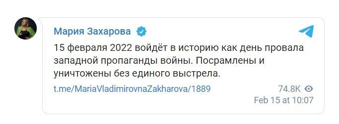 В свою очередь спикер российского МИД Мария Захарова заявила, якобы 15 февраля 2022 "войдет в историю как день провала западной пропаганды войны".