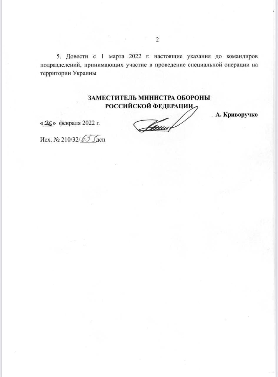 В приказе требуется забрать у всех российских военных документы, которые могут подтвердить личность, а тела уже погибших оккупантов с 1 марта вывезти тайно в ночное время в РФ или Беларусь, чтобы похоронить на братской могиле под номерами.