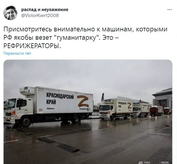А вот для вывоза трупов россия отправила в Украину колонну рефрижераторов, которую прикрыли "гуманитаркой".