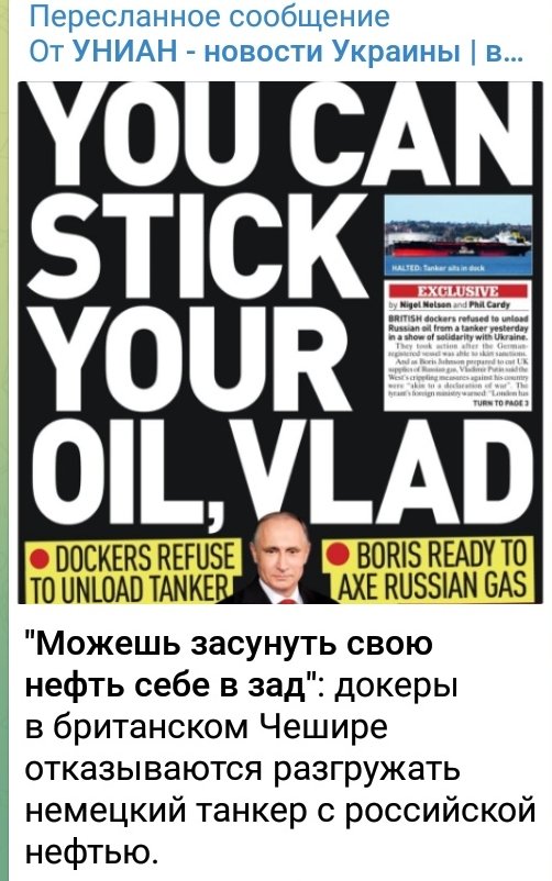Ранее профсоюзы рабочих нефтеперерабатывающих заводов в Стэнлоу, Чешире в Великобритании отказались разгружать немецкие танкеры с российской нефтью. А местная газета The Sunday People вышла с обращением к президенту РФ Владимиру Путину на обложке: "засунь свою нефть, Влад".