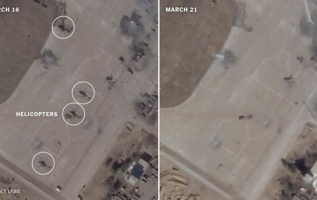 Российские оккупанты вывели большую часть вертолетов с аэродрома в Чернобаевке под Херсоном после успешной атаки украинской армии. Об этом 22 марта сообщила газета The New York Times, которая проанализировала спутниковые снимки компании Planet Labs.