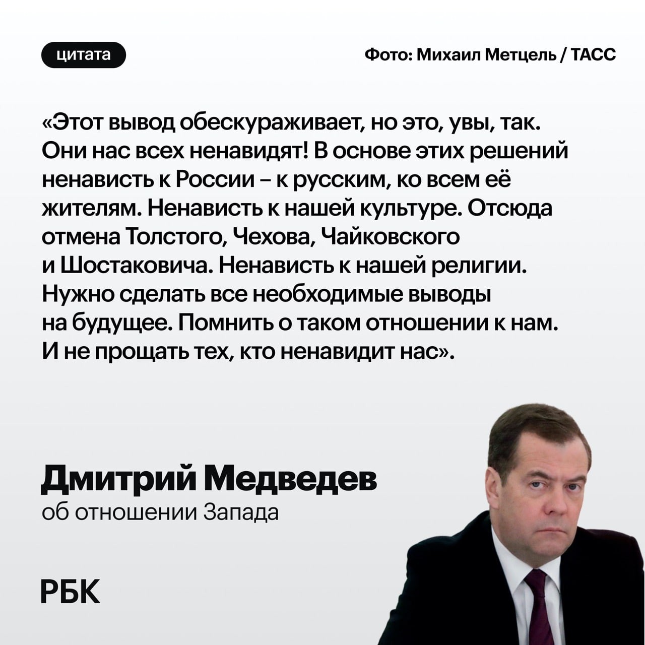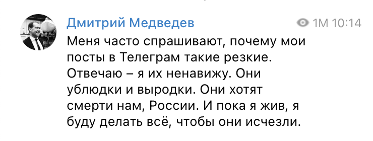 "Этот вывод обескураживает, но это, увы, так. Они нас всех ненавидят! В основе этих решений ненависть к России – к русским, ко всем ее жителям. Ненависть к нашей культуре... Эта ненависть омерзительна и иррациональна", – написал тогда Медведев и призвал сограждан никогда не прощать Запад.