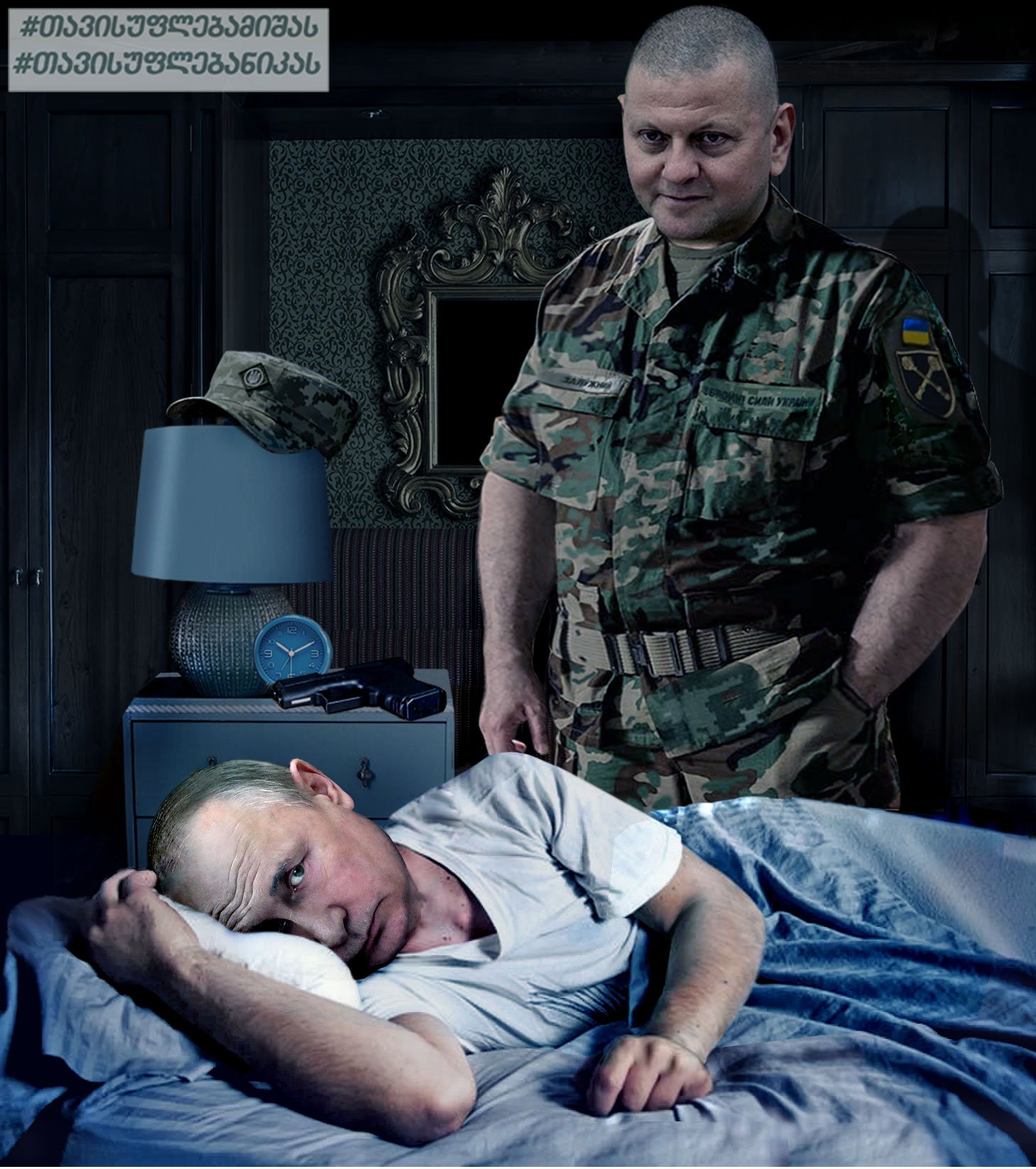 Залужный в это время стоит за спиной кремлевского вождя и спокойно улыбается. Внимание Метревели, как всегда, уделил деталям. Так, например, на тумбочке президента РФ уже приготовлен пистолет, которым главнокомандующий ВСУ совершит "жест доброй воли", покончив с кровавым диктатором. Оружие лежит возле будильника, будто намекая, что назавтра Путин уже не проснется.