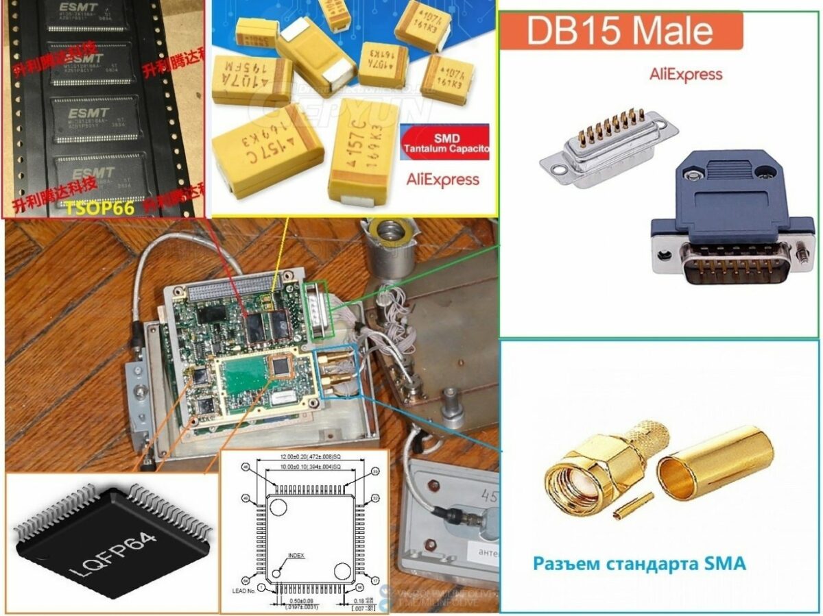Главный блок содержит две микросхемы в корпусе TSOP66, три микросхемы в корпусе LQFP64, танталовые конденсаторы SMD, разъемы DB15 и SMA. Все эти компоненты можно купить на китайском сайте AliExpress.