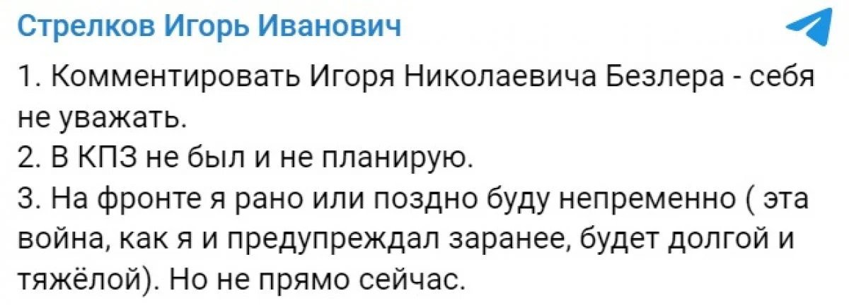 "Комментировать Игоря Николаевича Безлера - себя не уважать. В КПЗ не был и не планирую. На фронте я рано или поздно буду непременно (эта война, как я и предупреждал заранее, будет долгой и тяжёлой). Но не прямо сейчас", - коротко написал он.