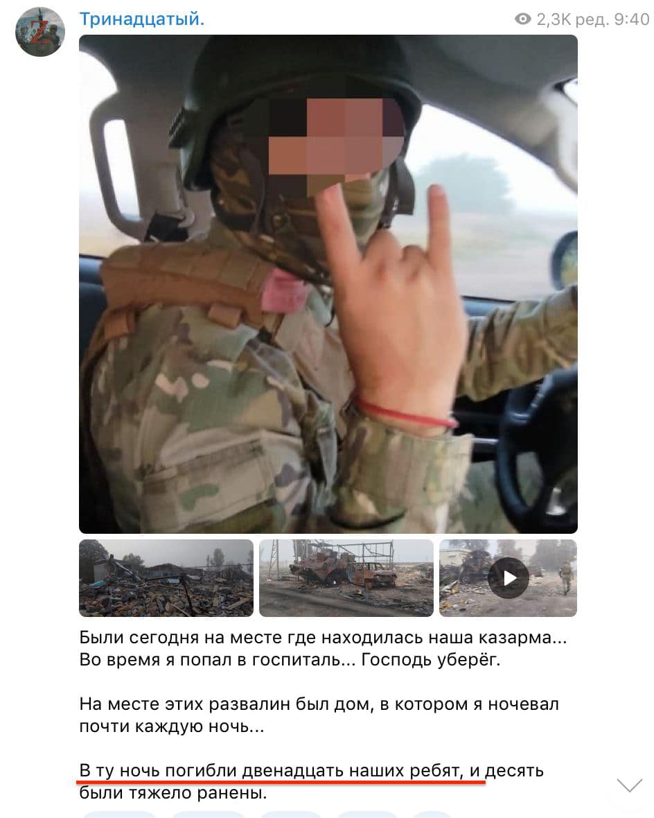 Оккупанты в Telegram-каналах заявили, что в результате удара погибли по меньшей мере 12 российских военных и 10 получили ранения.
