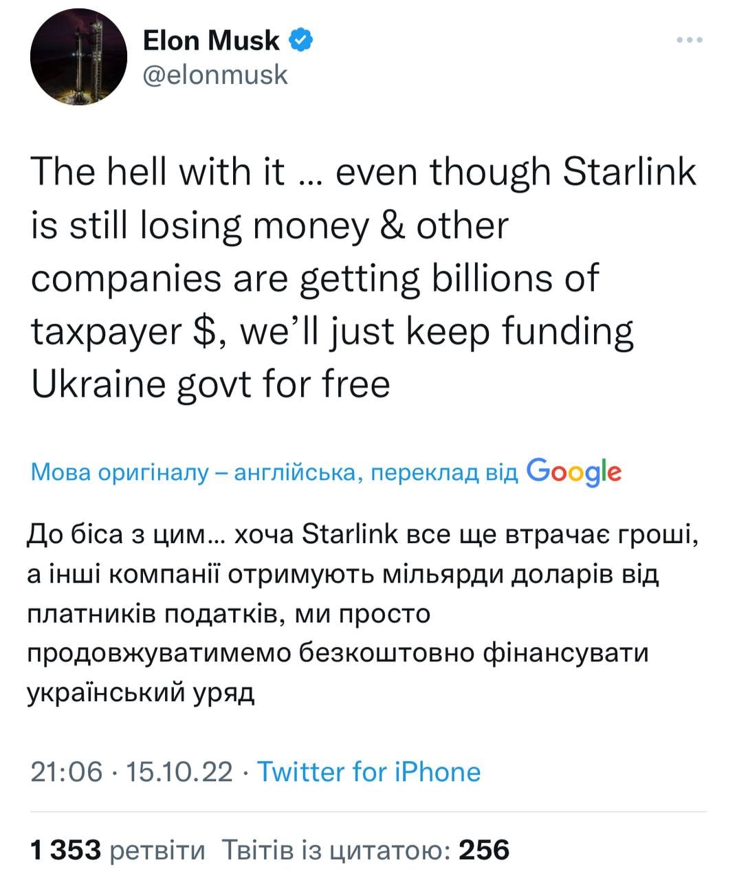 "Бес с ним… хотя Starlink все еще теряет деньги, а другие компании получают миллиарды долларов от налогоплательщиков, мы будем просто продолжать бесплатно финансировать украинское правительство", – написал он.