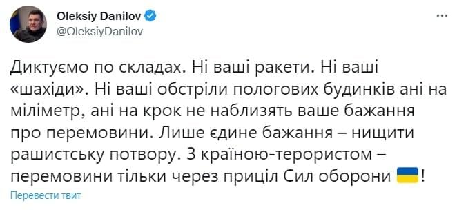 "Ни ваши ракеты. Ни ваши "шахиды". Ни ваши обстрелы роддомов ни на миллиметр, ни на шаг не приблизят ваше желание о переговорах. Лишь единственное желание - уничтожать рашистскую тварь. Со страной-террористом – переговоры только через прицел Сил обороны Украины", - написал секретарь СНБО.