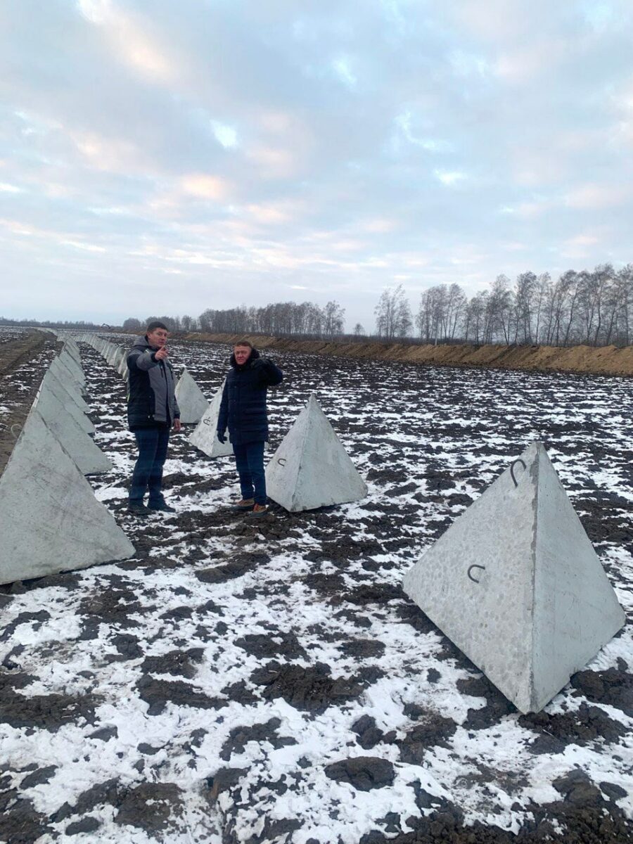 На обнародованных фото можно заметить, что в полях устанавливают бетонные пирамидальные противотанковые сооружения, известные как «зубы дракона».