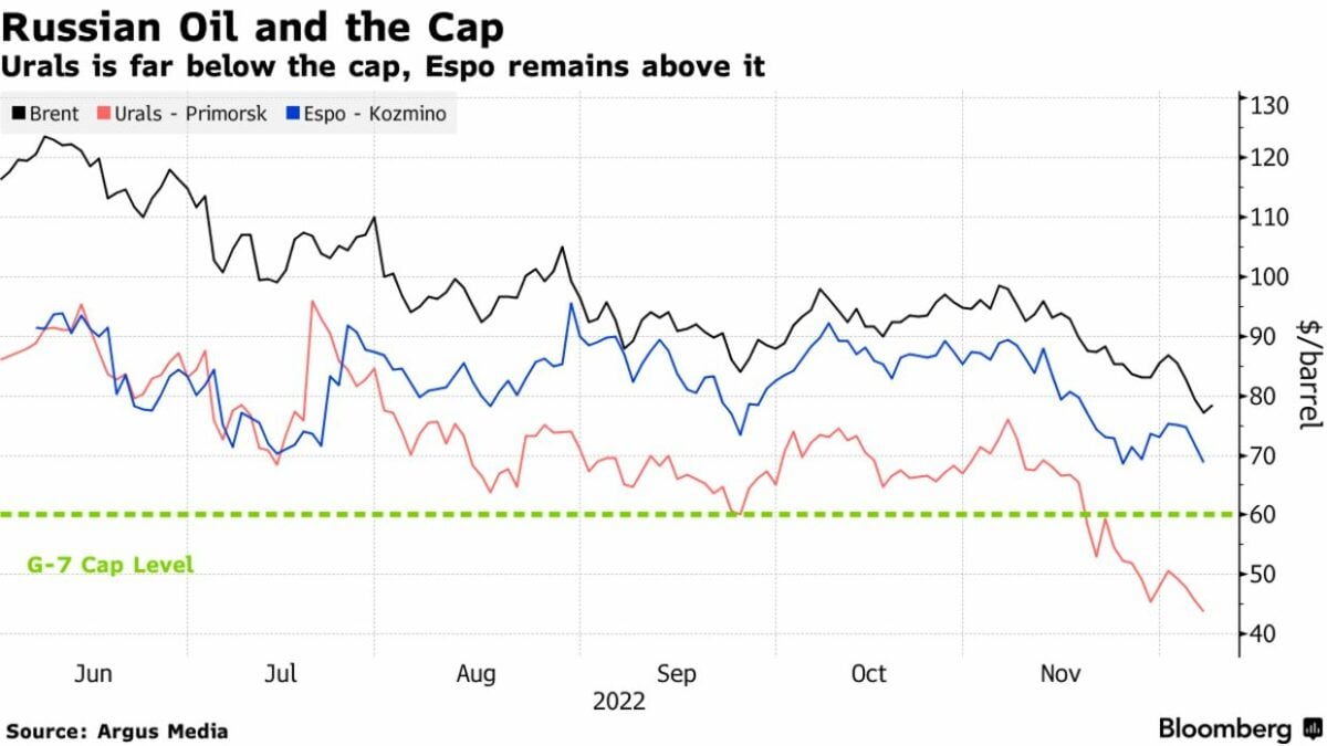 После введения группой G7, Австралией и Евросоюзом потолка цен в $60 на морские поставки российской нефти и вступившего в действие европейского эмбарго, стоимость основного для России экспортного сорта Urals с отгрузкой в Приморске упала до $43,72 за баррель. Об этом сообщает Bloomberg со ссылкой на данные ценового агентства Argus.