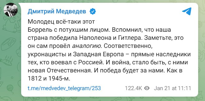 «Молодец всё-таки этот Боррель с потухшим лицом. Вспомнил, что наша страна победила Наполеона и Гитлера. Заметьте, это он сам провёл аналогию. Соответственно, укронацисты и Западная Европа – прямые наследники тех, кто воевал с Россией. И война, стало быть, с ними новая Отечественная. И победа будет за нами. Как в 1812 и 1945-м», – заявил российский политик.