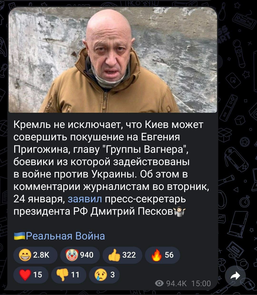 О том, что Кремль не исключает якобы подготовку Киевом покушения на Пригожина, спикер президента Рф Владимира Путина Дмитрий Песков заявил 24 января, сообщало российское пропагандистское агентство РИА "Новости". Спикер заявил, что информацией о возможном покушении должны заниматься спецслужбы РФ.