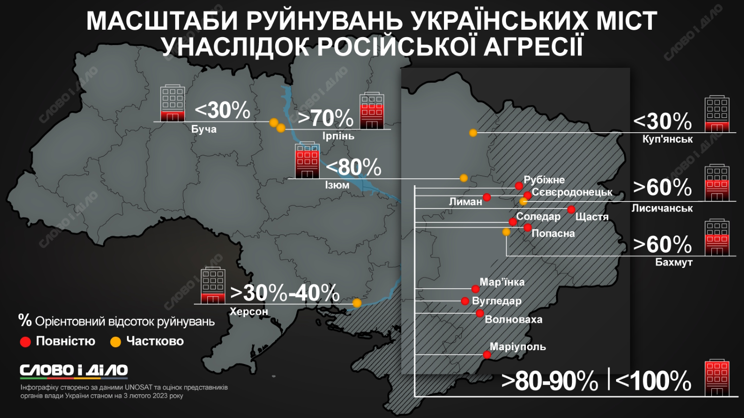 Инфографику частичного и полного разрушения Россией украинских городов публикует "Слово и дело".