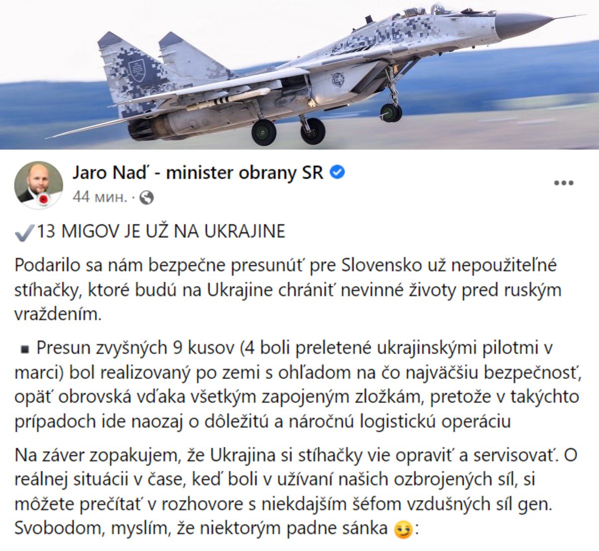 "Нам удалось безопасно перебросить больше не используемых Словакией истребителей, чтобы защитить невинные жизни украинцев", - пишет министр обороны Словакии Ярослав Надь.