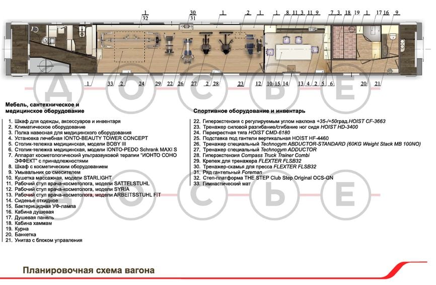 Как пишет ресурс, журналисты изучили данные госзакупок и «Циркон Сервиса» — компании, которая строит вагоны для Путина. Их в президентском составе 22 — в том числе три ресторана, а также «спортивно-оздоровительный» вагон. В спецпоезде для главы Кремля оборудовали: