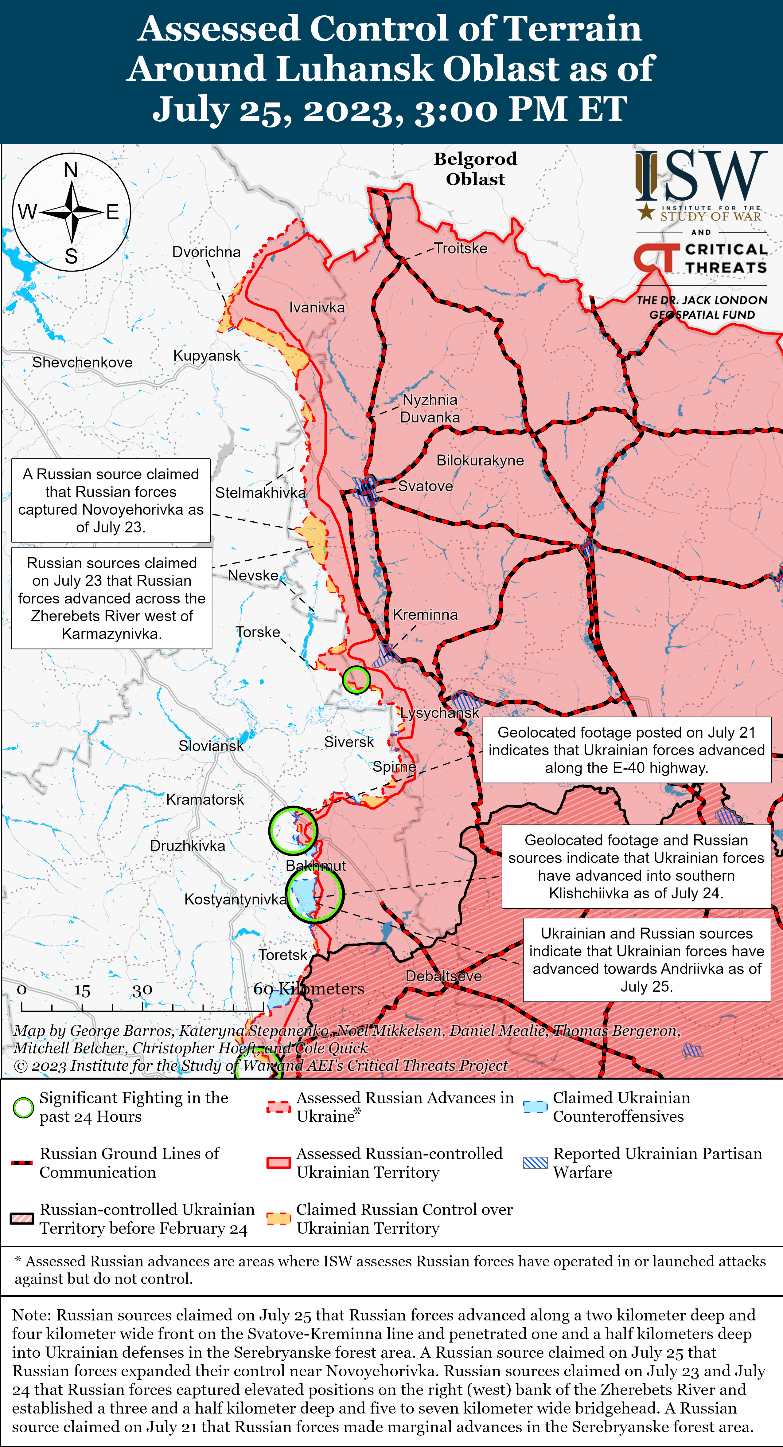 Российские войска вели наступательные операции вблизи Сватова и, как утверждали, наступали 25 июля. Министерство обороны России (МО) заявило, что подразделения 15-й мотострелковой бригады (2-я общевойсковая армия Центрального военного округа) захватили Сергеевку (12 км юго-западнее Сватового) и продвинулись вдоль фронта шириной в четыре километра на глубину двух километров в этом районе. . Однако ISW не нашел визуального подтверждения этого заявления.
