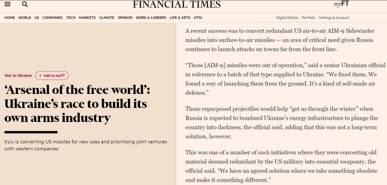 Украинские специалисты переоборудовали переданные Соединенными Штатами Америки управляемые ракеты типа «воздух-воздух» AIM-9M Sidewinder для истребителей F-16 на ракеты «земля-воздух», и теперь их смогут использовать силы ПВО. Об этом сообщает Financial Times.