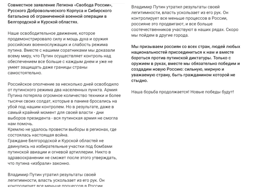Совместное заявление Легиона «Свобода России», Русского Добровольческого Корпуса и Сибирского батальона о результатах ограниченной военной операции в Белгородской и Курской областях.