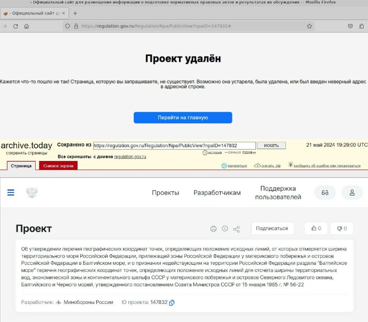 С сайта правительства России пропал законопроект, предлагавший одностороннее изменение Россией ее границ с Финляндией, Эстонией и Литвой в Балтийском море. На сайте archive.is осталась сохраненная копия описания законопроекта.