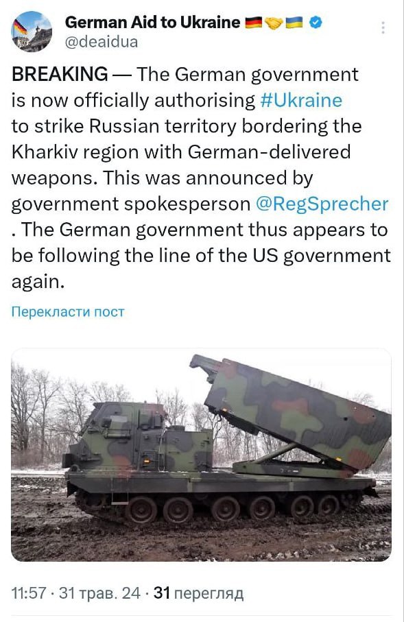 Германия разрешила Украине бить по РФ ее оружием