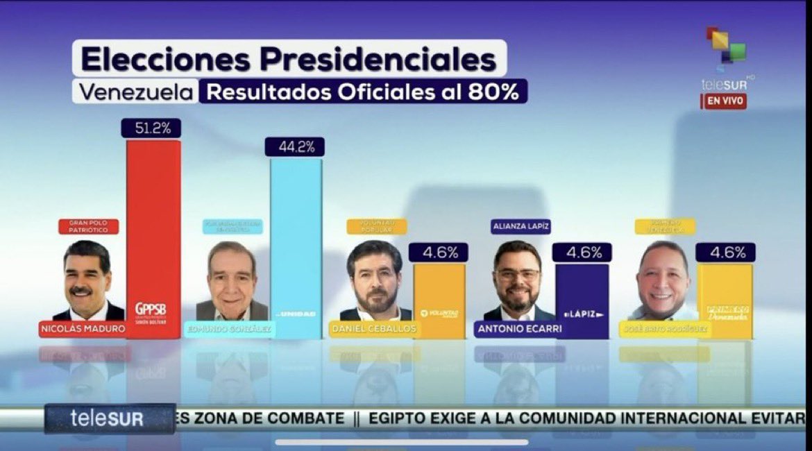 Оппозиция параллельно объявила о победе своего представителя, бывшего дипломата Эдмундо Гонсалеса, за которого якобы проголосовали 70% пришедших на выборы венесуэльцев.