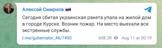ПВО страны-агрессора РФ в ночь с 10-го на 11 августа сбила ракету над российским Курском, в результате чего возник пожар в жилом доме. Об этом в Telegram заявил врио губернатора Курской области Алексей Смирнов.