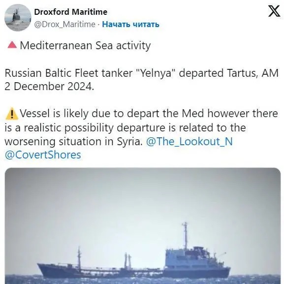 О том, что вспомогательное судно «Ельня» уходит из Тартуса, написал и военно-аналитический блог Droxford Maritime.