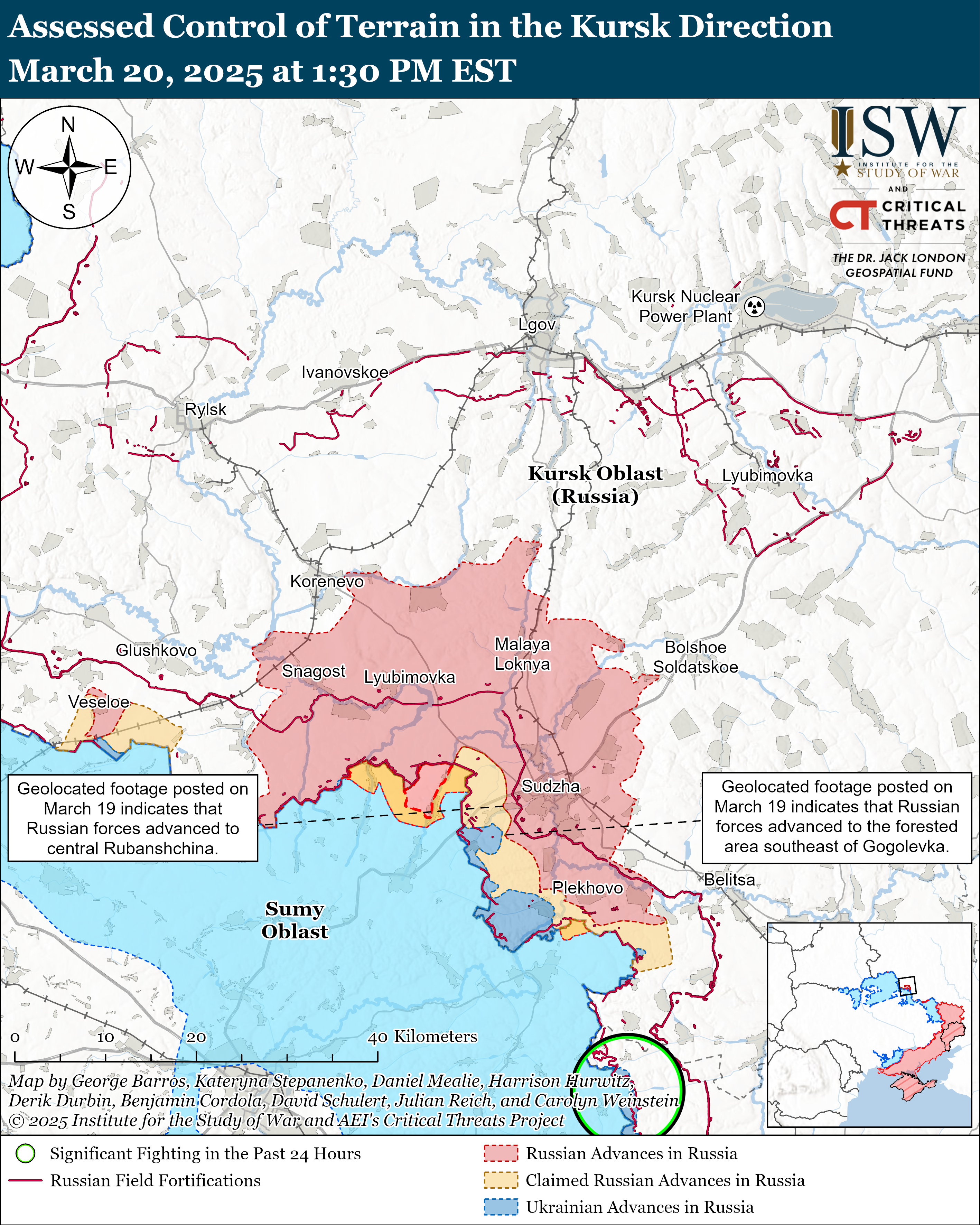 Войска РФ продвинулись в Курской области. Геолокационные кадры, опубликованные 19 марта, показывают, что российские войска продвинулись на севере Рубанщины (к западу от Суджи) и в лесистой местности к юго-востоку от Гоголевки (непосредственно к западу от Рубанщины).