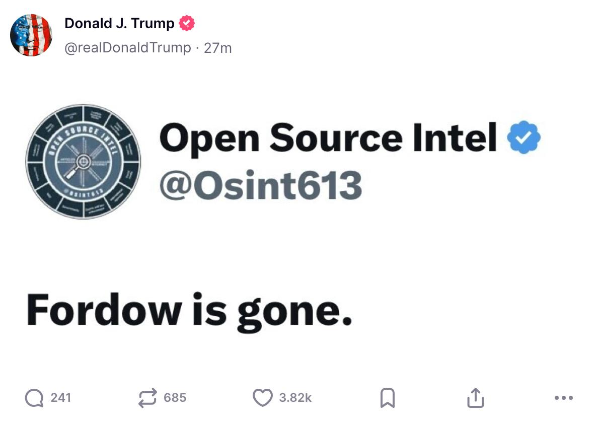 Позже Трамп опубликовал в Truth Social скриншот из OSINT-аккаунта Open Source Intel с текстом "Фордо больше нет":
